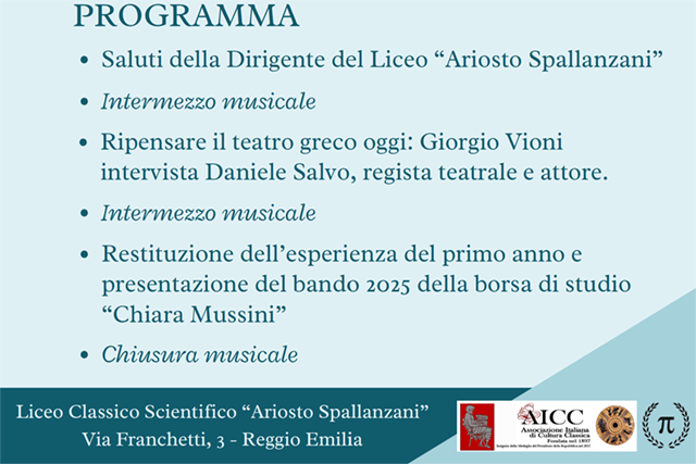 Istituita a partire dall’anno 2024, la “Borsa di studio Chiara Mussini” vuole ricordare la professoressa Chiara Mussini, la sua passione per le lingue e in particolare per il neogreco, cui ha dedicato molta parte della sua attività didattica e professionale, soprattutto presso il Liceo Ariosto Spallanzani di Reggio Emilia, che patrocina l’iniziativa.